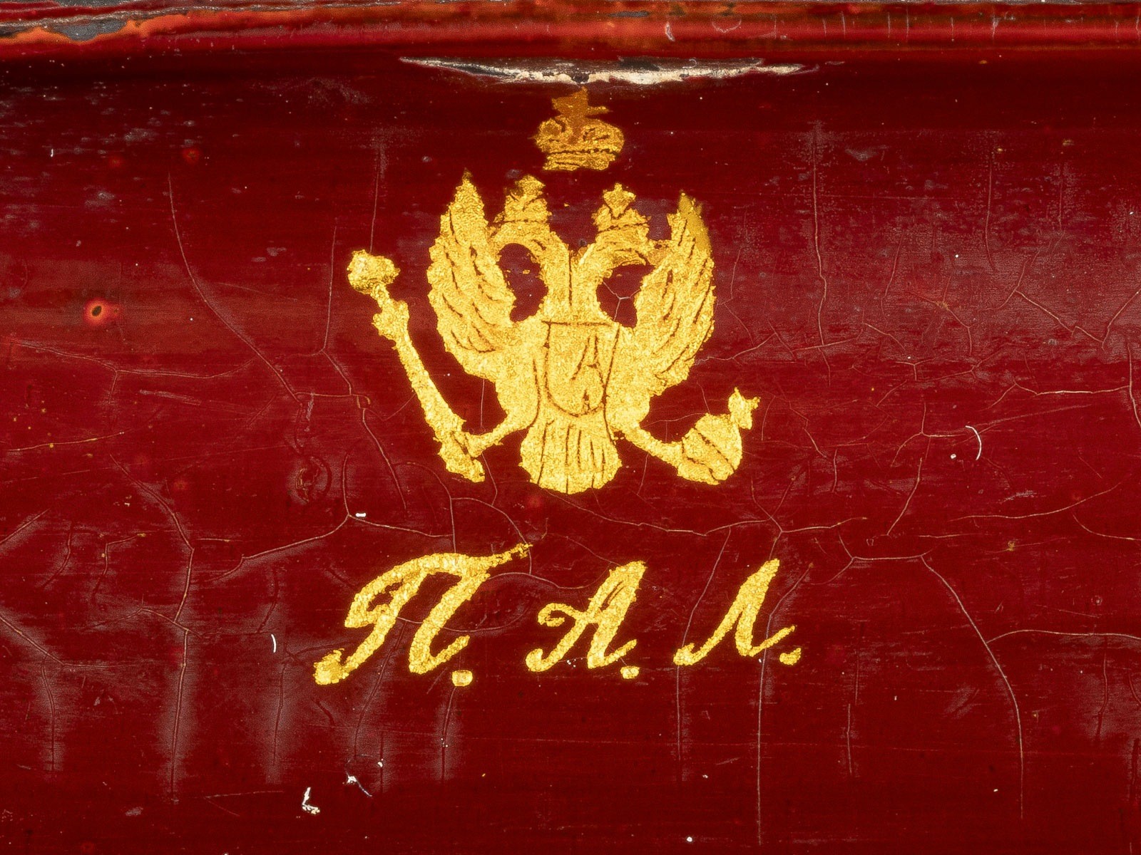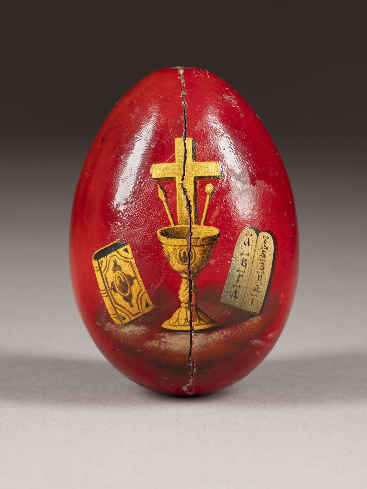 Papiermaché, Rotlack, opake Ölmalerei, teils über Metallfolie. H. 8,5 cm. Verso Kreuz, Kelch und die Heilige Schrift. Riss, besch.