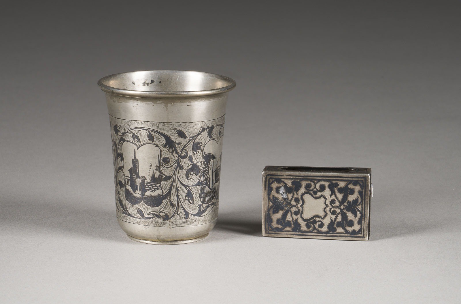 Silber, graviert, nielliert. H. 6,4 cm, L. 4,4 cm, 72 g. Vollständig punziert mit Beschaumarken, Feingehalt '84' und Meisterzeichen. Dellen.
