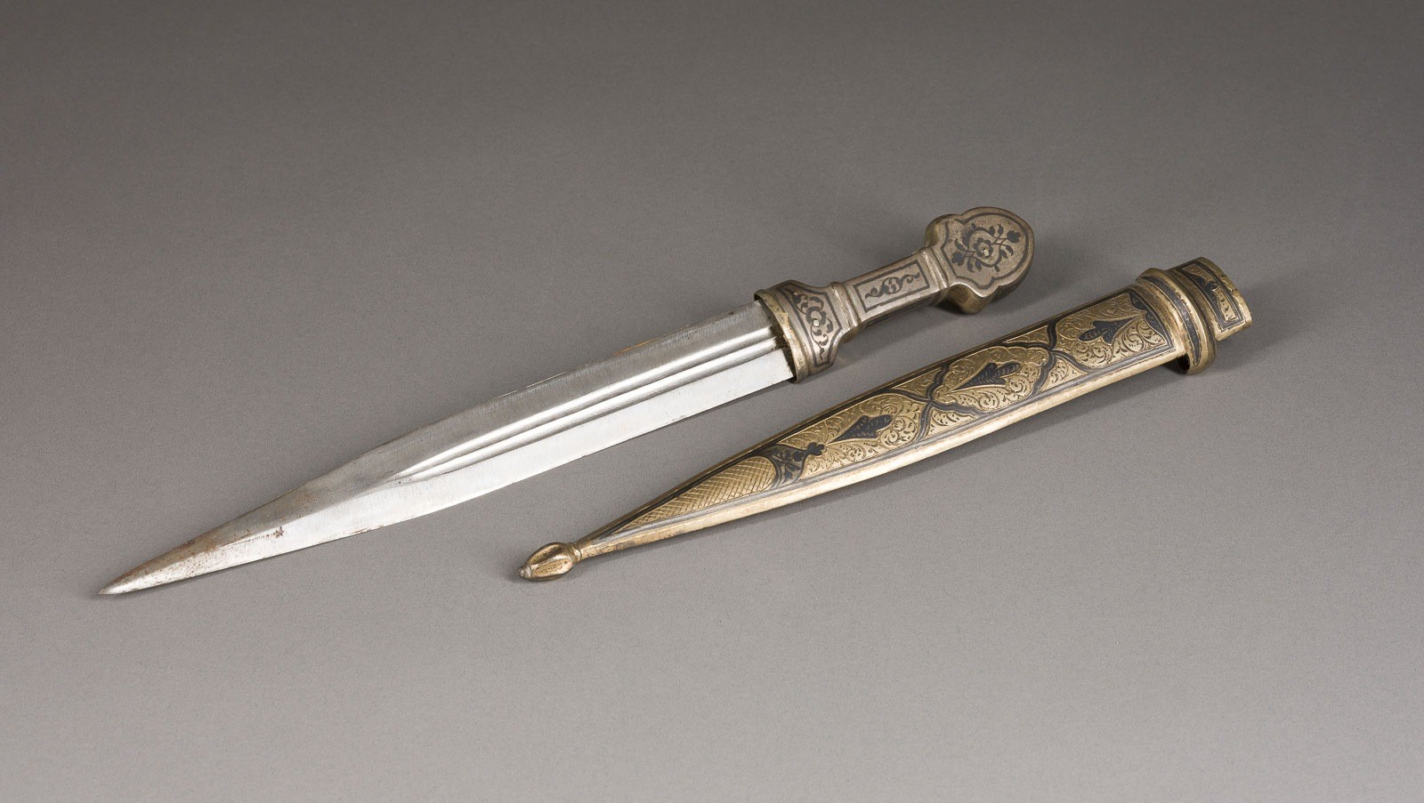 Metall, teils vergoldet, graviert, nielliert. L. 41 cm. Gebrauchsspuren.