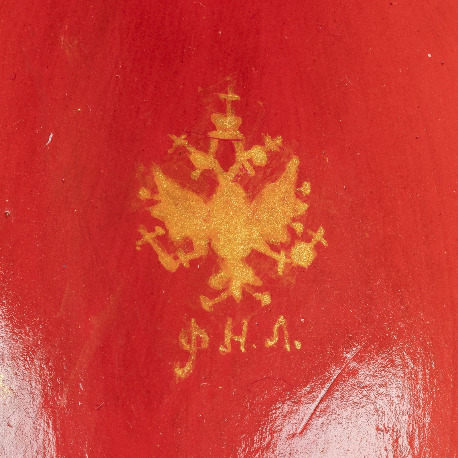 Papiermaché, Rotlack, polychrome Bemalung, teils über Metallfolie. H. 9,8 cm. Im Inneren in Gold signiert 'F.N.L.' in Kyrillisch mit Doppeladler. Min. rest.