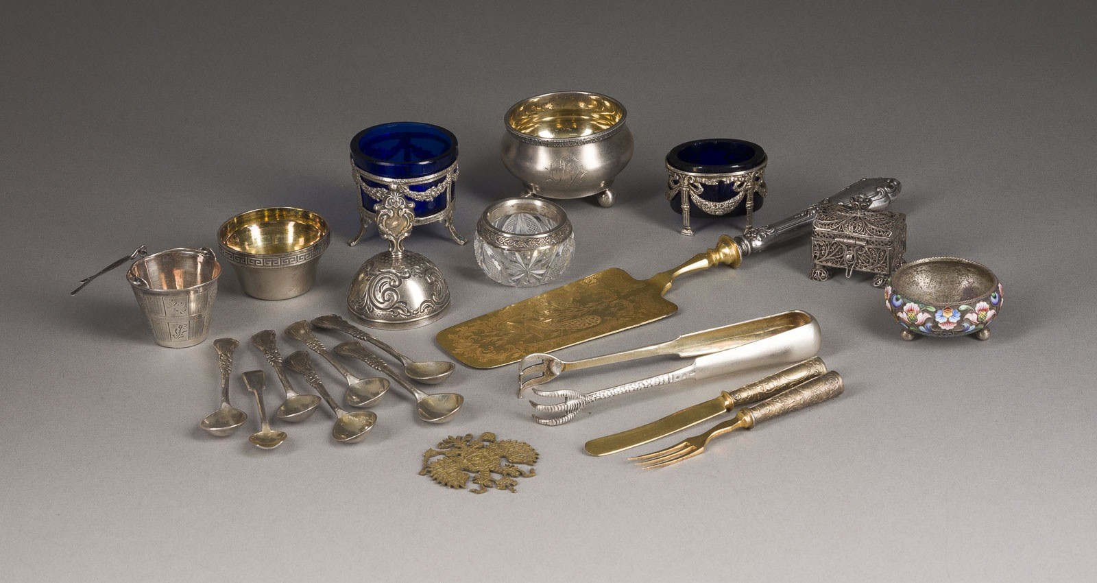 Silber, teils gegossen, teils graviert, schattiertes Cloisonné-Email, teils vergoldet, blaues Glas, Filigran, Messing. H. 2,3-6 cm, L. 5,3-14 cm, 411 g. Teils punziert mit Beschaumarken, Feingehalt '84' und '875' und Meistermarken. Teils min. best.