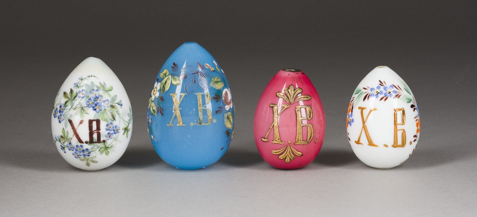 Porzellan/blaues Glas, polychrome Bemalung. H. 6,5-8,5 cm.
