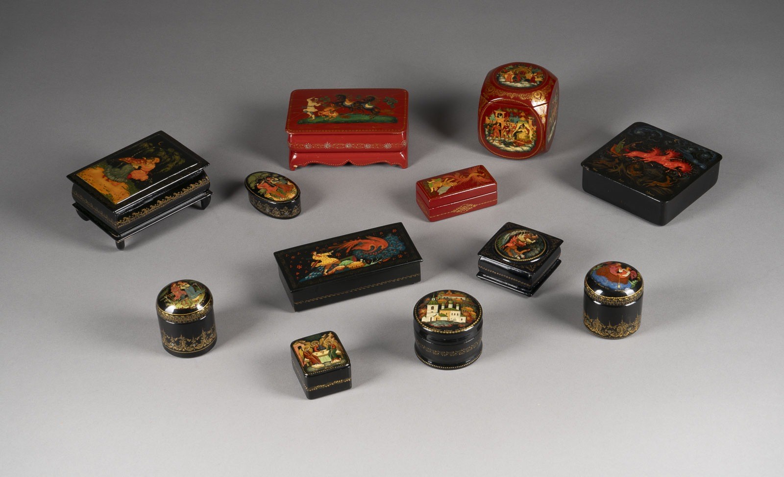 Papiermaché, Schwarz- bzw. Rotlack, polychrome Bemalung, teils vergoldet. L. 5-12,5 cm. Jew. in Kyrillisch betitelt und signiert, teils ortbez. und datiert. Teils mit Krakelee, eine Dose innen part. besch (Lack).