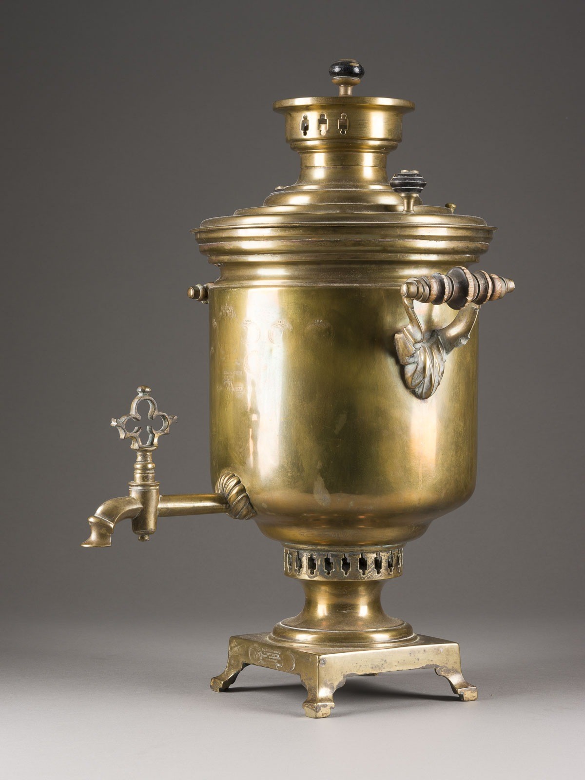 Messing, getrieben, Holzisolierungen. H. 48 cm. Drei kyrillische Firmenmarken mit zwölf Medaillen.