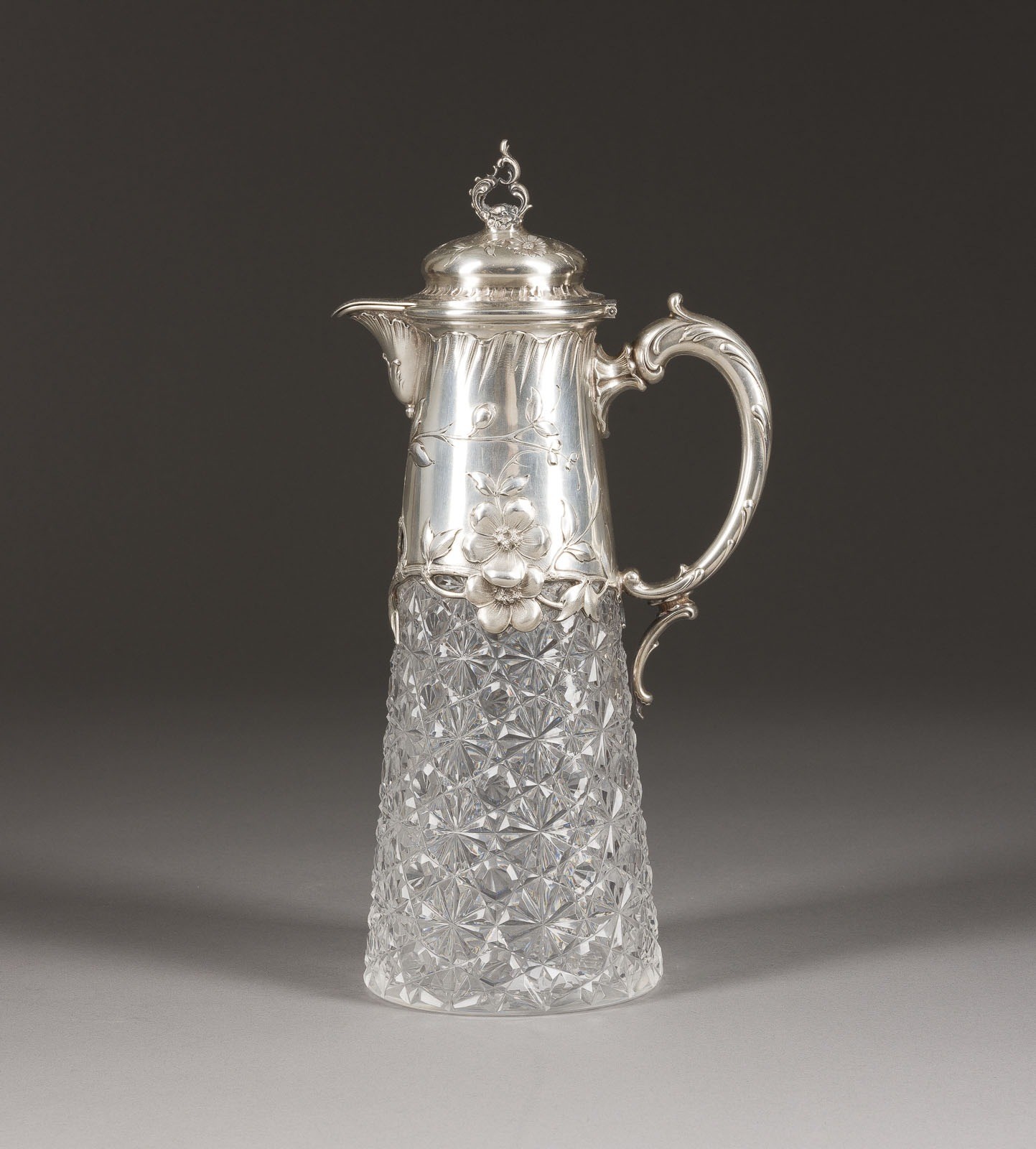 Farbloses, schliffverziertes Glas, Silbermontierung mit Reliefdekor. H. 29 cm. Herstellermarke, russische Importmarke mit Feingehalt '84'.