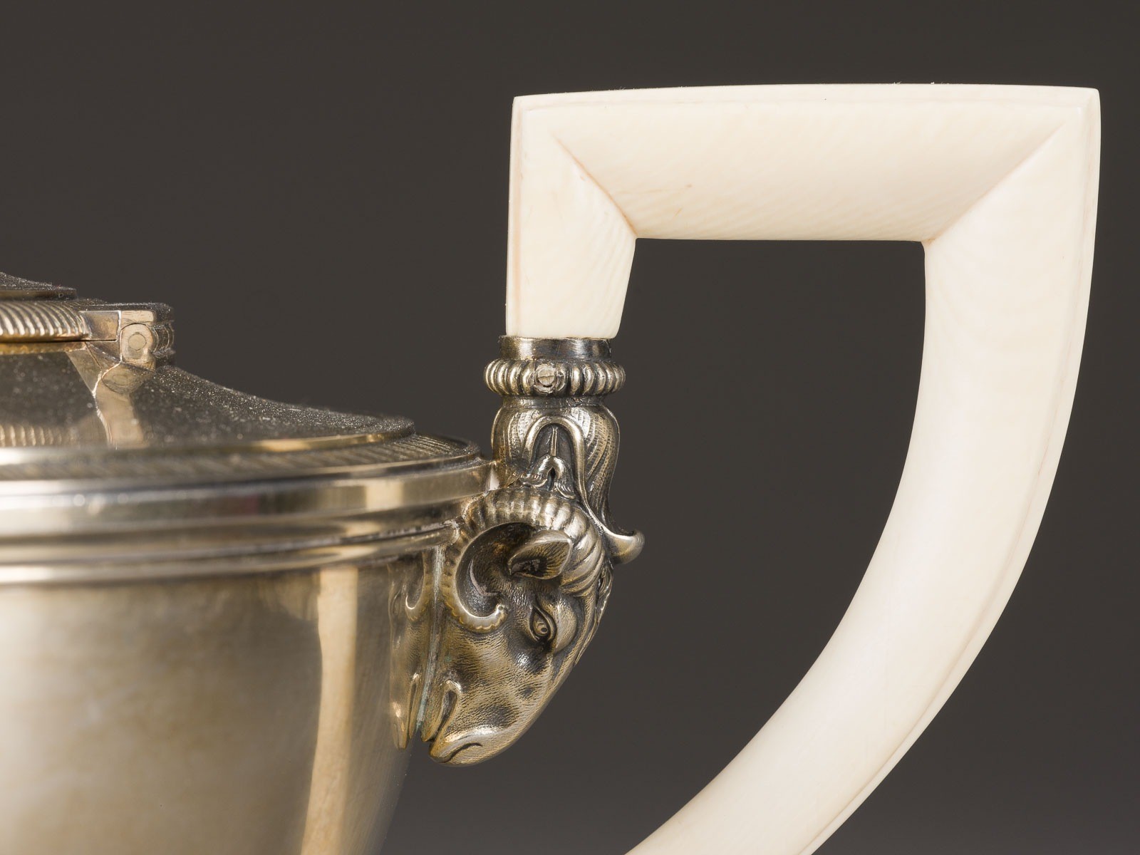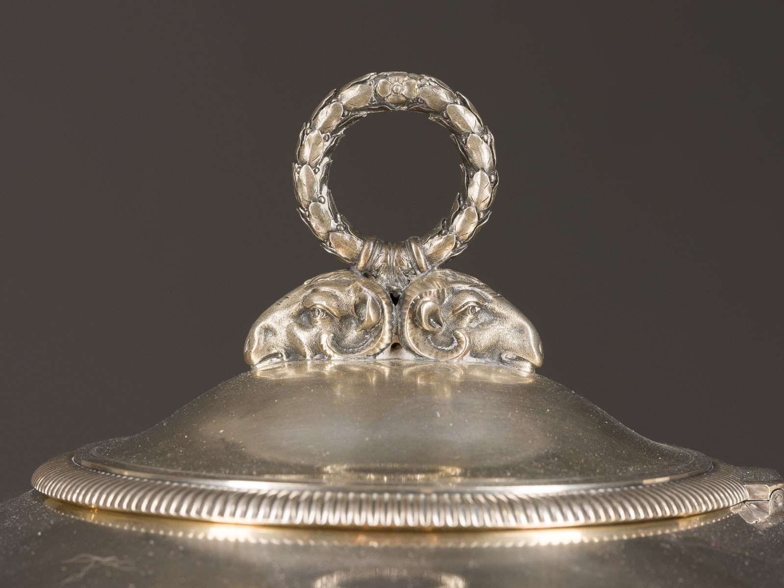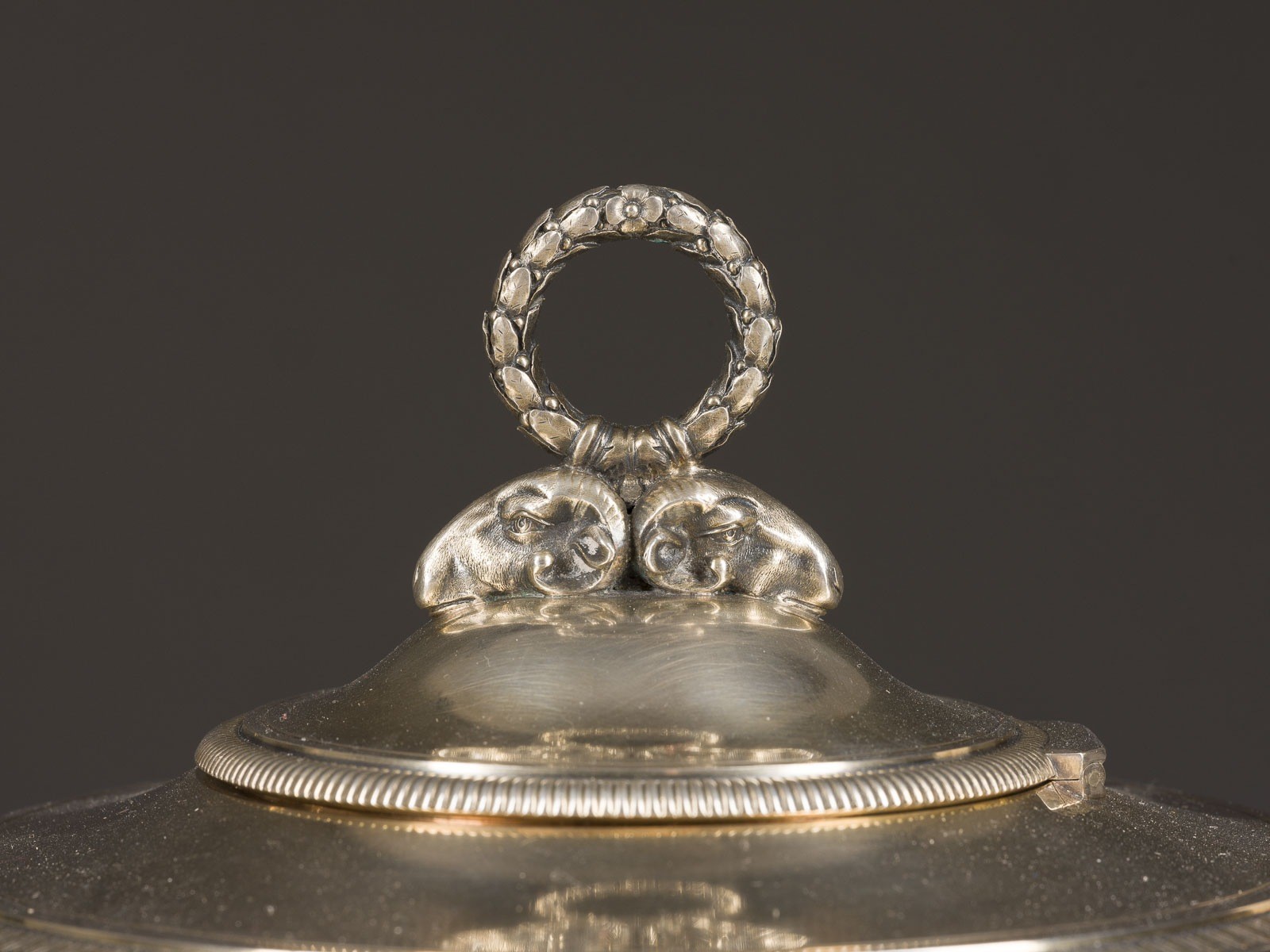 Scharnierdeckeln zieren plastisch gearbeitete Widderköpfe. Min. gedellt.