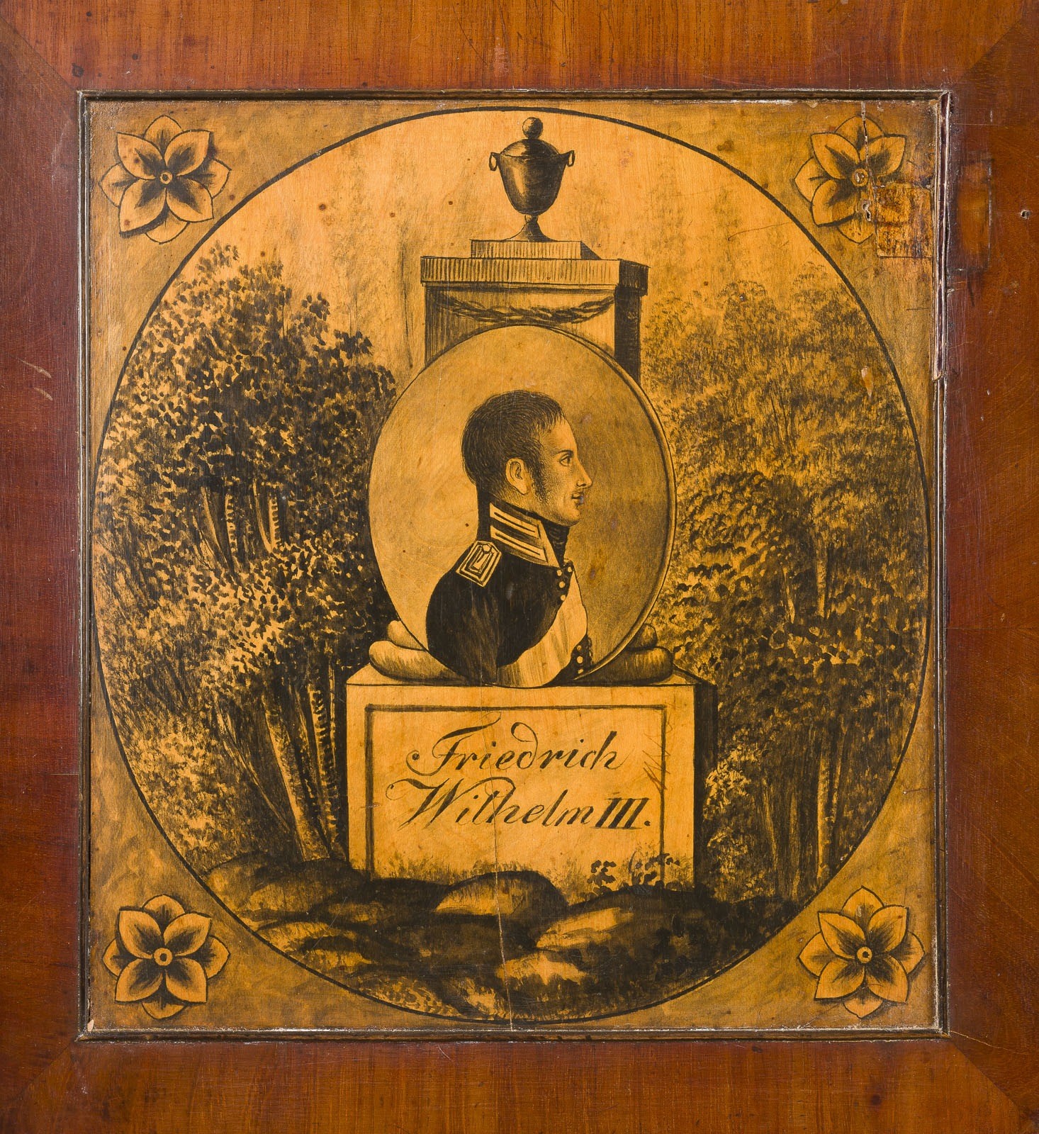 und zwei seitliche Fächer. Die Türfronten sind mit Porträts von König Friedrich Wilhelm