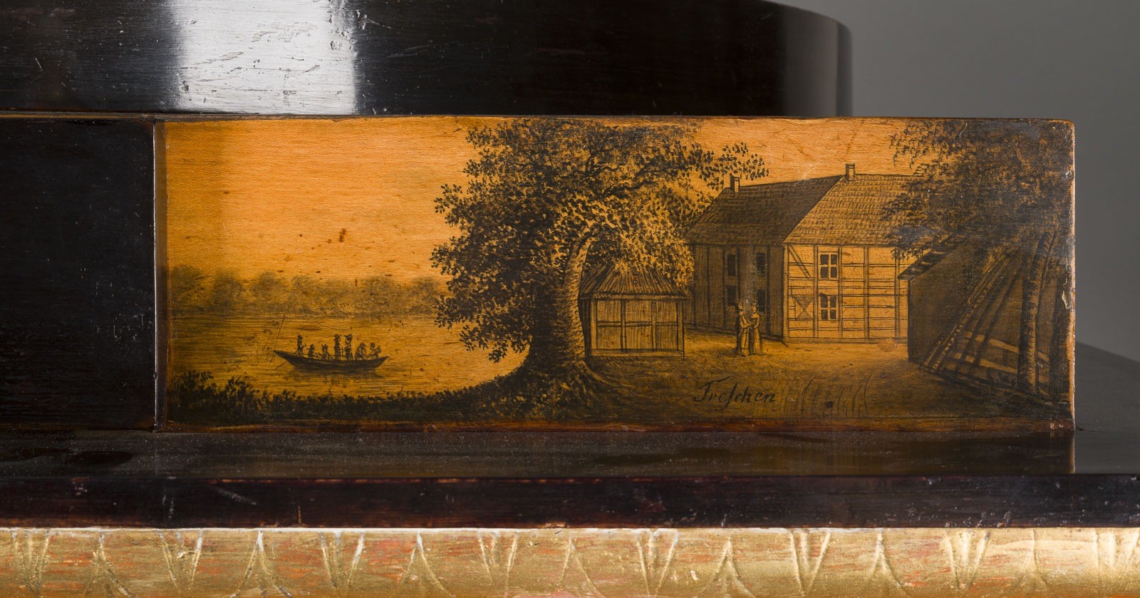 Personenstaffage und Natur darstellen. Der Innenbereich umfasst sechs kleine Schubladen