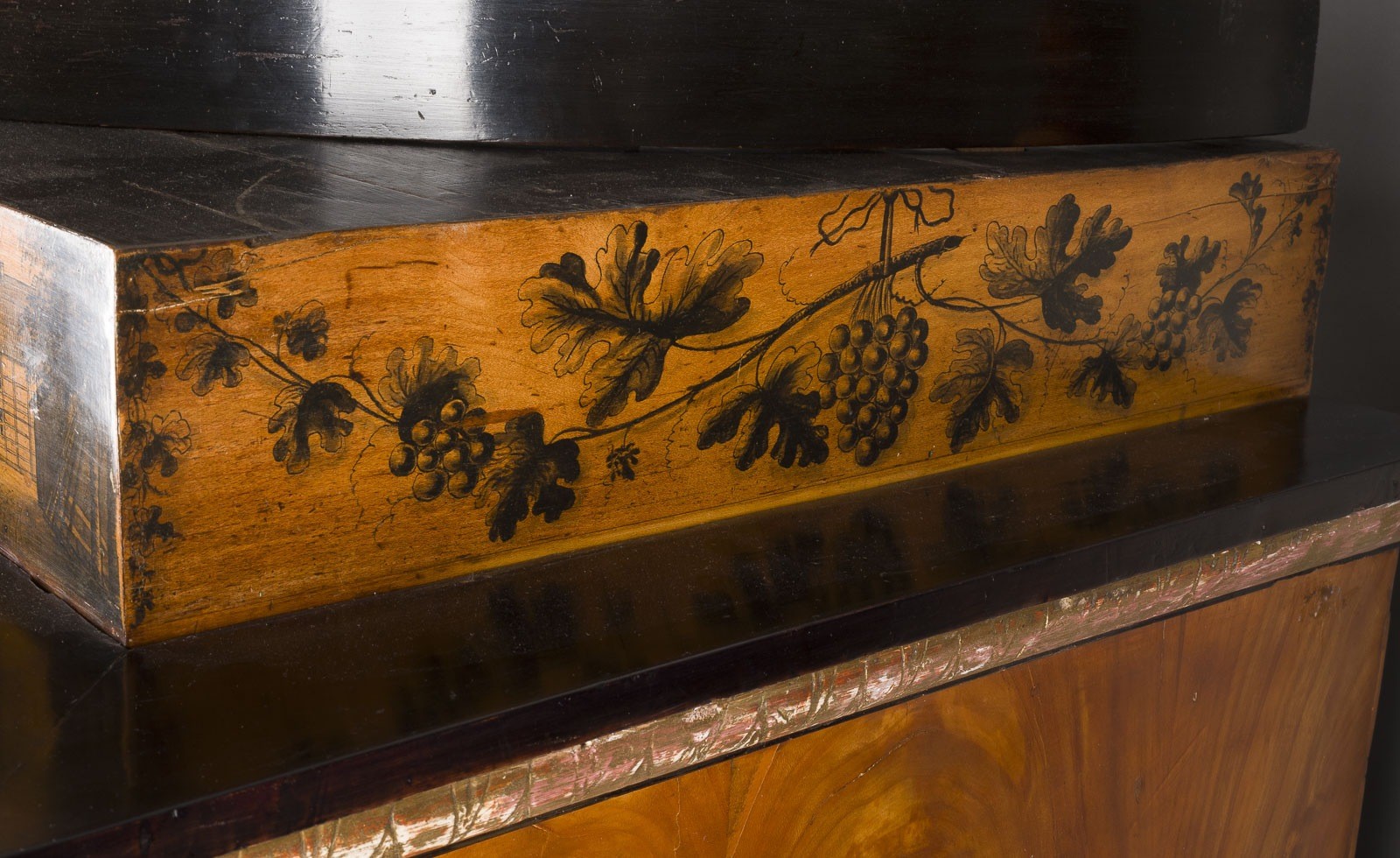 Birkenbaumholz, poliert, ebonisiertes Holz, dekorative Schwarzlotmalerei. 164 x 103 x 53 cm. Bedeutender Sekretär mit aufklappbarem Schreibpult und drei breiten Schubladen. Die obere