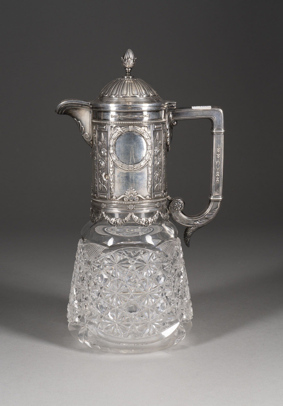 Farbloses, schliffverziertes Glas. Silber. H. 29 cm. Punziert '9M', '13' und '10756'.
