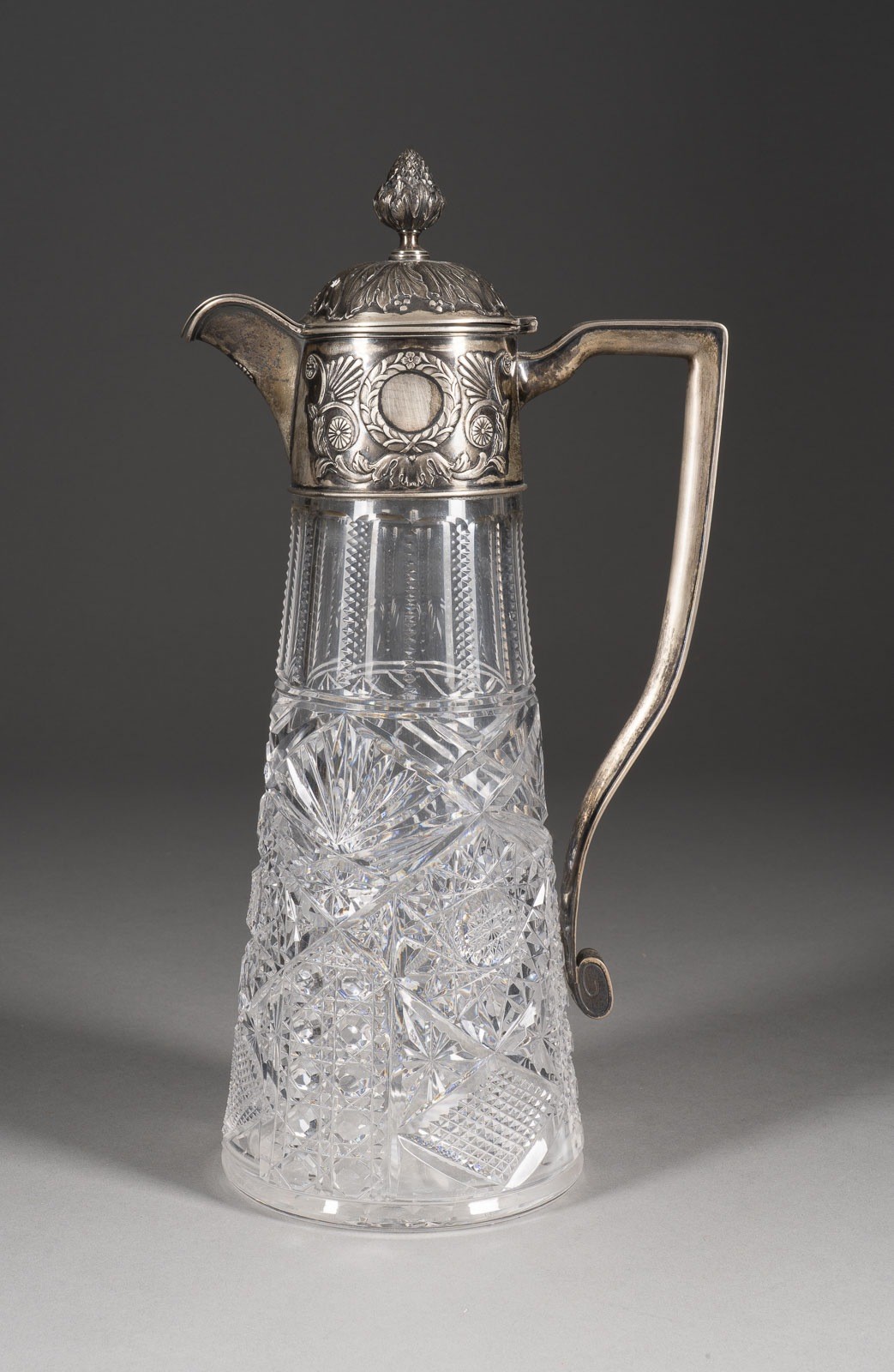 Farbloses, schliffverziertes Glas. Silbermontierung mit Reliefdekor: Akanthusblätter und Palmettmotive. H. 30 cm. Punziert mit Marke der Bezirksbeschauadministration mit Feingehalt '84' und Meisterzeichen 'GRATSCHEW' in Kyrillisch mit Hoflieferantenzeichen.
