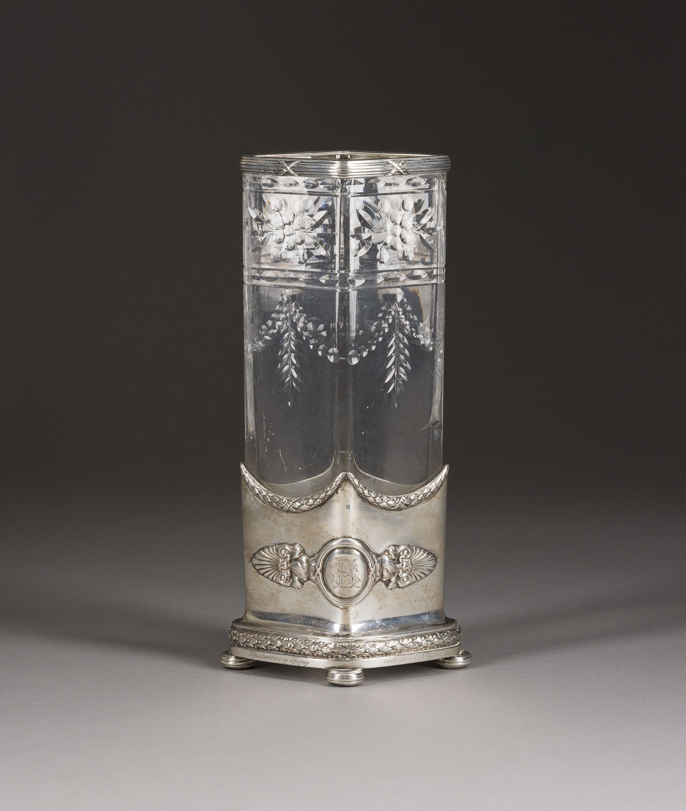 Farbloses, schliffverziertes Glas. Silbermontierung mit Reliefdekor. H. 27,7 cm. Punziert mit Marke der Bezirksbeschauadministration mit Feingehalt '84' und Meisterzeichen 'GRATSCHEW' in Kyrillisch mit Hoflieferantenzeichen. Sprung.