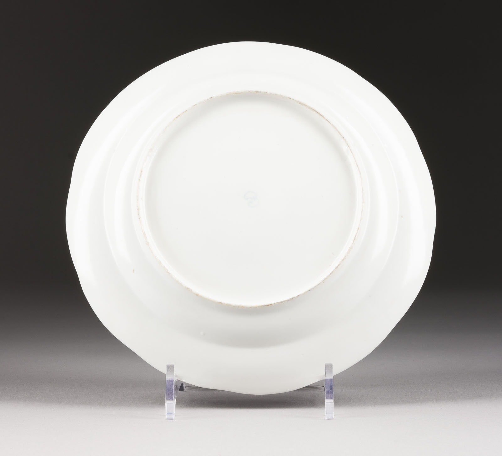Porzellan, polychrome Aufglasurbemalung, Goldstaffage. D. 24,5 cm. Unterglasurblaue Manufakturmarke 'EII'. Restauriert.