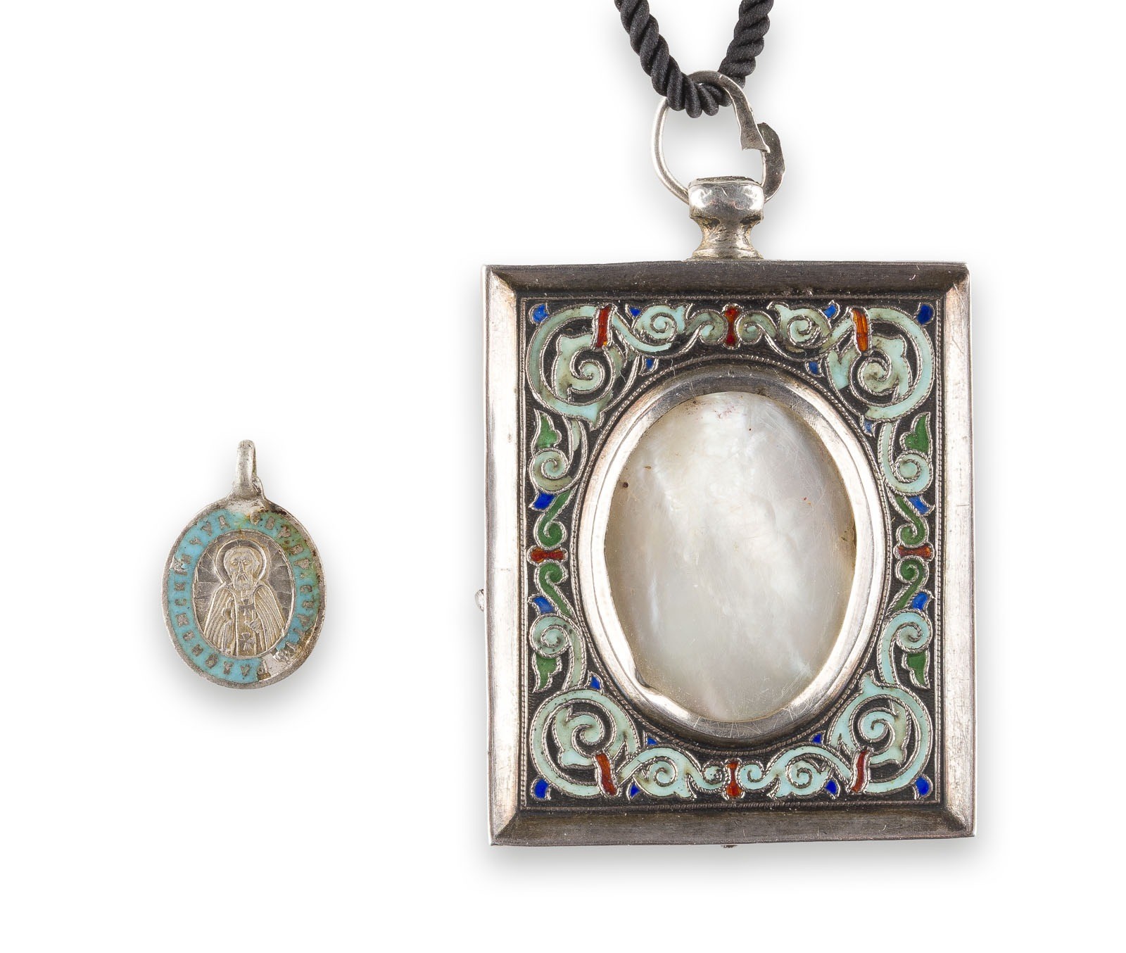 Silber, Email, Perlmutt. L. 1,8/5,2 cm. Punziert mit Marke der Bezirksbeschauadministration und Meisterzeichen. Ein Anhänger mit dem heiligen Sergej von Radonesch. Email min. best.