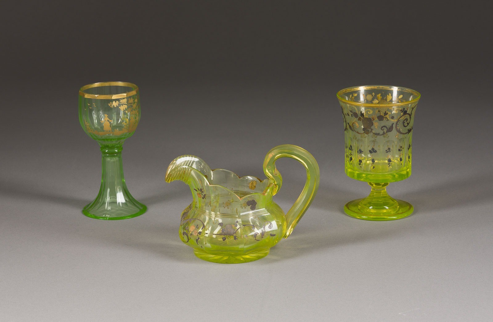 Uranglas, Gold- und Silbermalerei. H. 10,5-13 cm. Ein Glas unten min. best.