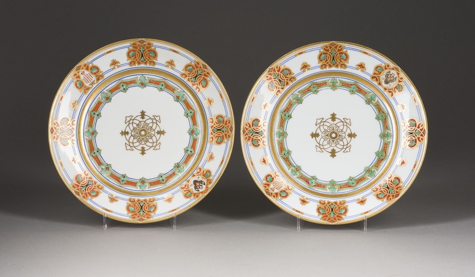Porzellan, polychrome Aufglasurbemalung, Goldstaffage. D. 24 cm. Unterglasurblaue Manufakturmarke 'NI' unter Krone, nummeriert in Gold '4.' bzw. '54.', ein Teller mit Pressmarke '46'. Dekoriert mit dem Monogramm des Großfürsten in Kyrillisch 'WKKN' und mit dem kaiserlichen