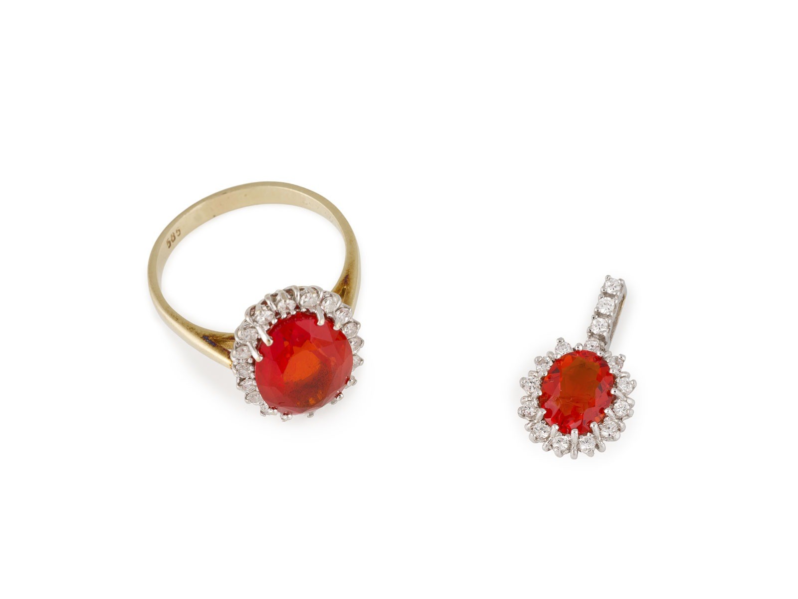 WG/GG 585. Ges.-Gew.: ca. 4,6 g. Schmuckset, bestehend aus einem Ring und einem Anhänger mit jeweils einem zentralen