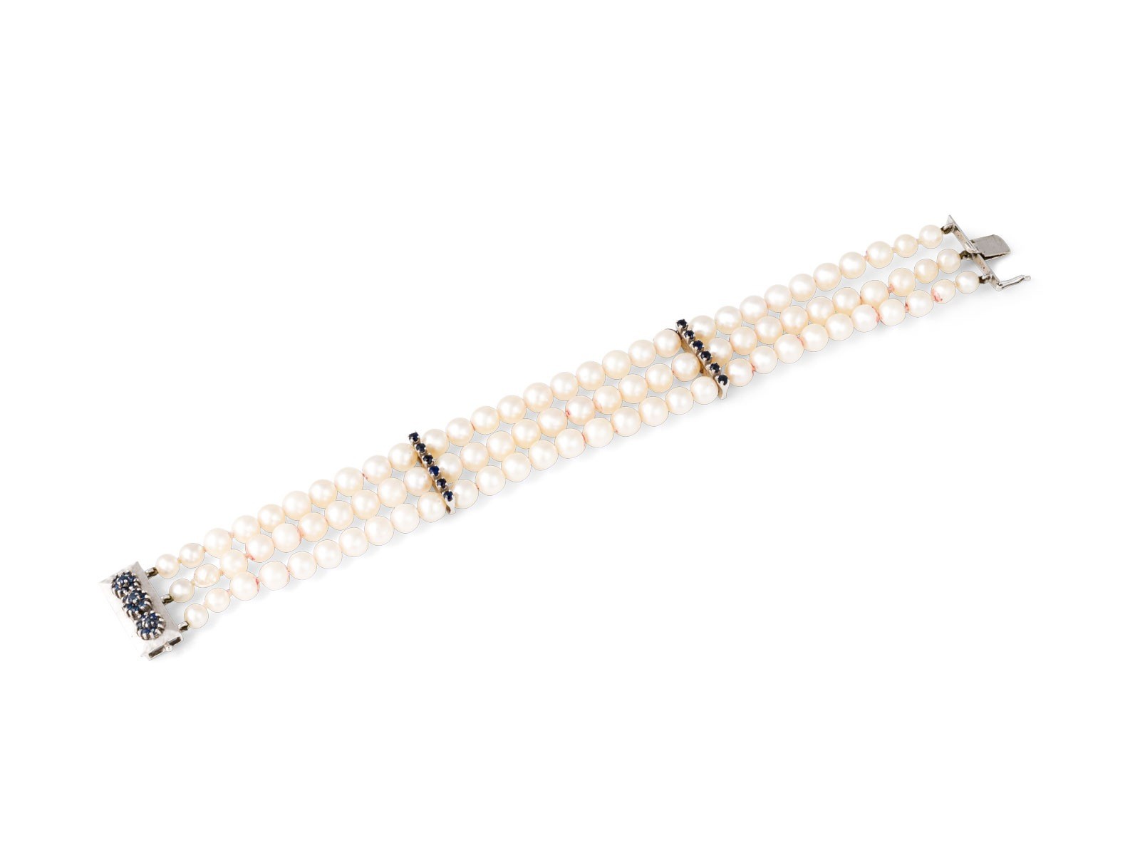 WG 585. Ges.-Gew.: ca. 38,0 g. Armband aus 3- reihigen Perlensträngen D.(Perle): ca. 6,0 mm - 6,5 mm. L.: 20,5 cm. B.: