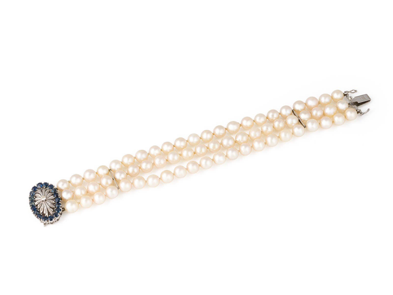 WG 750. Maße: L.: ca. 19,0 cm, B.: ca. 26,0 mm. Ges.-Gew.: ca. 41,6 g. 3-reihiges Perlen-Armband. D.(Perle): ca. 7,0 mm. Ovaler Verschluss, besetzt mit einem