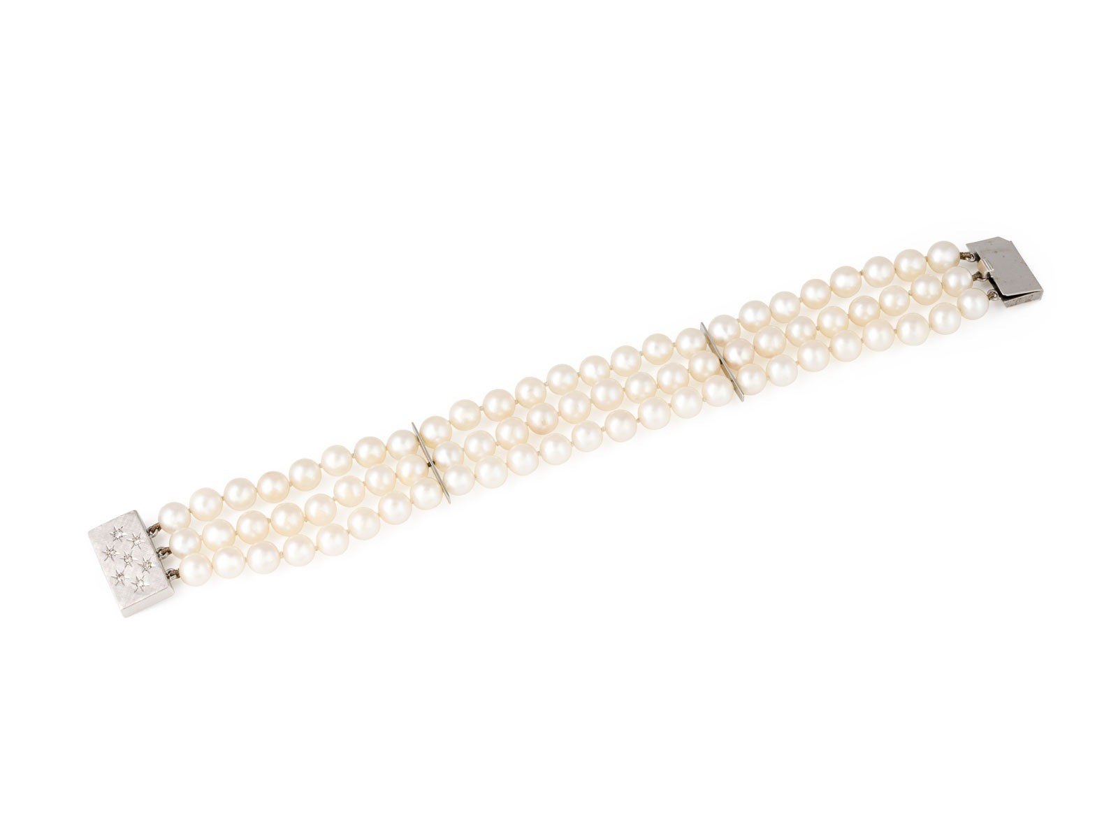 WG 585. Maße: L.: ca. 19,5 cm, B.: ca. 21,0 mm. Ges.-Gew.: ca. 37,6 g. 3 Reihiges Perlenarmband. D.(Perle): ca. 7,0 mm. Steckverschluss, besetzt mit 7 Diamanten