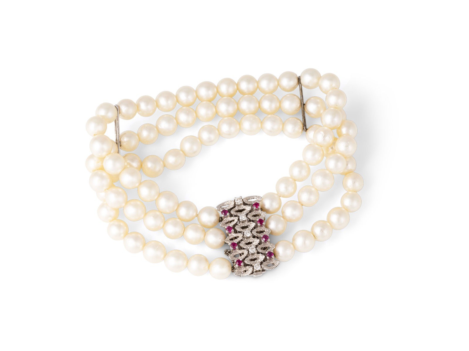 WG 585. Maße: L.: ca. 20,5 cm, B.: ca. 24,5 mm. Ges.-Gew.: ca. 40,7 g. 3-reihiges Perlenarmband D.(Perle): ca. 6,7 mm. Steckverschluss mit Sicherheitskette,