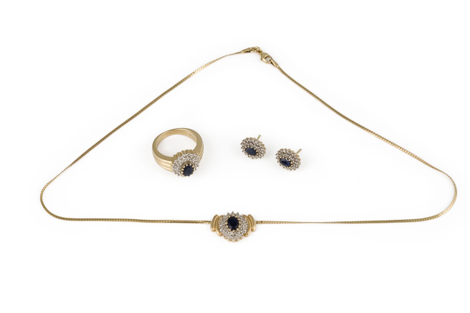 WG/GG 585. Ges.-Gew.: ca. 21,0 g. Schmuckset, bestehend aus 1x Ring, besetzt mit einem zentralen Saphir von ca. 0.80 ct. und einem doppelten Kranz aus Brillanten zus. ca. 0.40 ct., Ringmaß: ca.