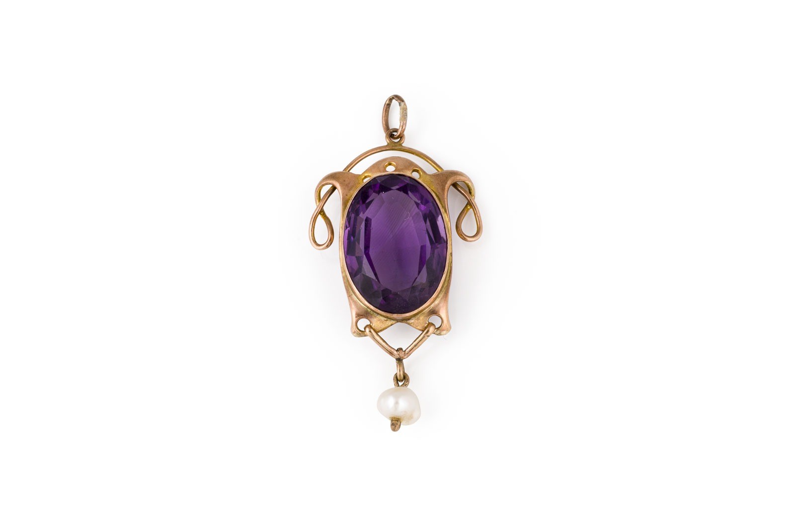 RG 333. Maße: ca. 48,0 x 24,0 mm. Ges.-Gew.: ca. 6,1 g. Anhänger, besetzt mit einem Amethyst von ca. 13.00 ct. und einer kleiner Perle. D.(Perle):