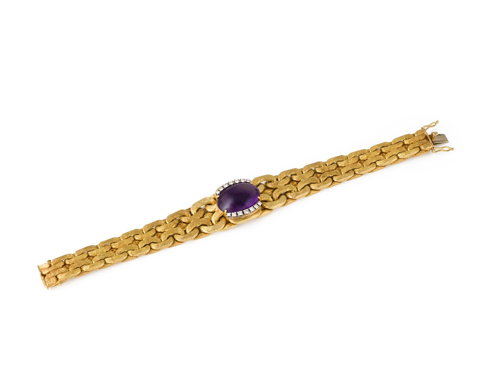 GG 750. Maße: L.: ca. 18,0 cm, B.: ca. 21,4 mm. Ges.-Gew.: ca. 55,0 g. Armband mit einem zentralen Amethyst Cabochon von ca. 16.84 ct., sowie 14 Brillanten zus.