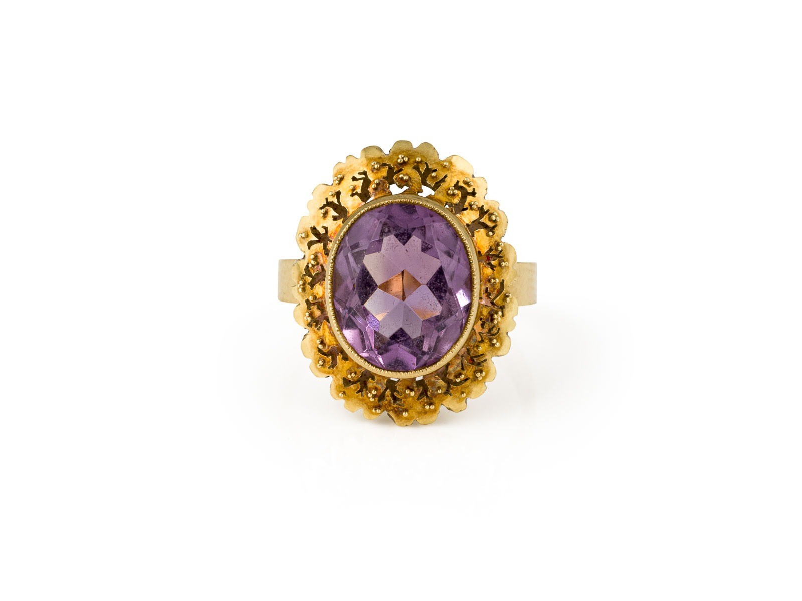 GG 585. Ringmaß: ca. 53. Ringkopfmaße: ca. 20,3 mm x 16,3. Ges.-Gew.: ca. 5,0 g. Ring, besetzt mit einem zentralen Amethyst von ca. 3.60 ct.