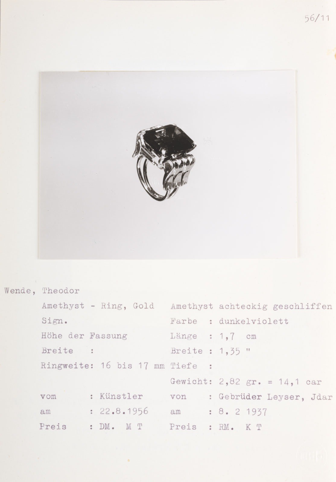 Der Amethyst wurden laut Aufzeichnungen in Idar-Oberstein von der Edelstein-Schleiferei "Gebrüder Leyser" facettiert und am 08.02.1937 erworben. Zum 22.08.1956 fertigte