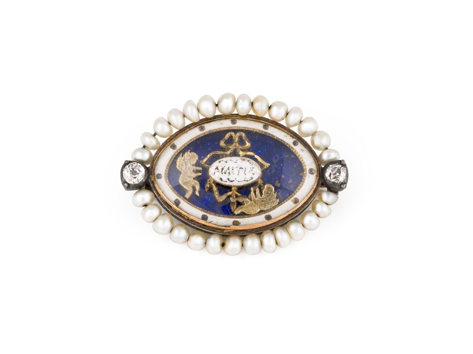 AG/GG 585 (getestet). Maße: ca. 34,0 x 24,7 mm. Ges.-Gew.: ca. 8,6 g. Emaillierte Brosche mit der Darstellung zweier Engel, umrandet mit einem Kranz aus Perlen,