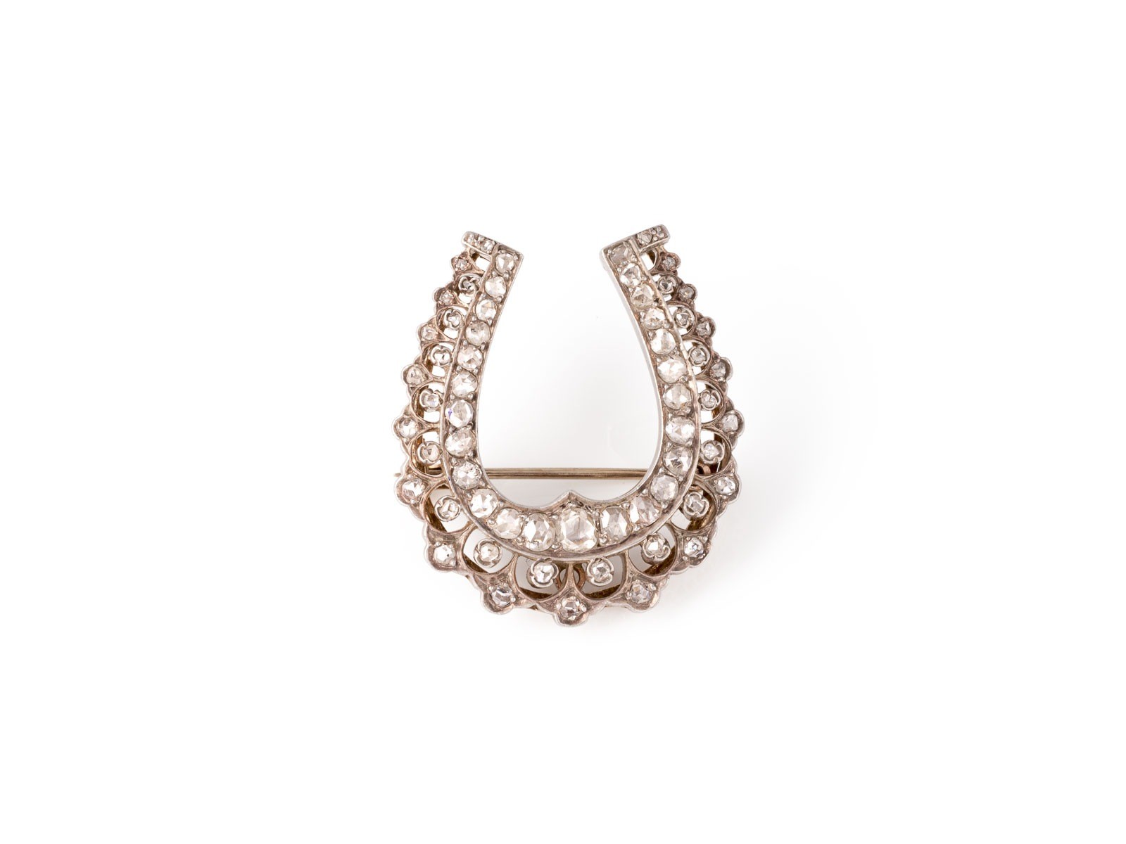 AG/RG 750 (getestet). Maße: L.: ca. 32,5 mm, B.: ca. 28,8 mm. Ges.-Gew.: ca. 10,4 g. Antike Hufeisen-Brosche mit üppigem Diamantbesatz im Rosenschliff zus. ca. 1.50 ct.