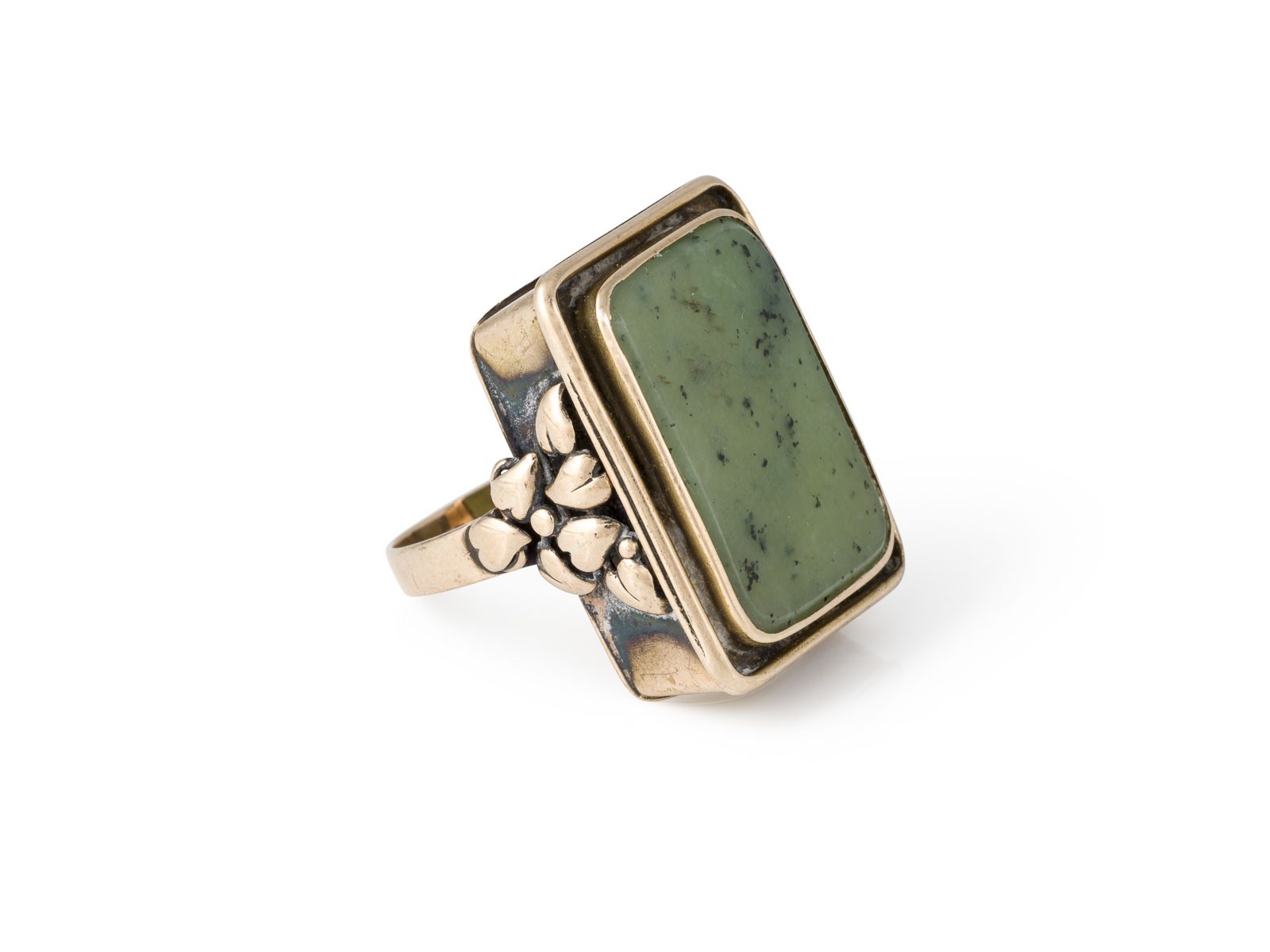GG 585. Ringmaß: ca. 57. Ringkopfmaße: ca. 18,6 mm x 24,9. Ges.-Gew.: ca. 9,1 g. Großer Ring mit einem rechteckigen, grünen Farbstein - wohl Nephrit-Jade (14,0 mm x 20,5
