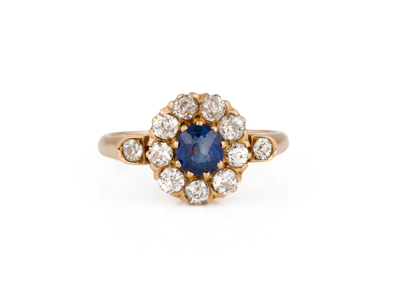 RG 585. Ringmaß 58. Ges.-Gew.: ca. 3,9 g. 1 oval facettierter Saphir, ca. 0,54 ct. und 11 Diamanten im Altschliff mit insg. ca. 0,84