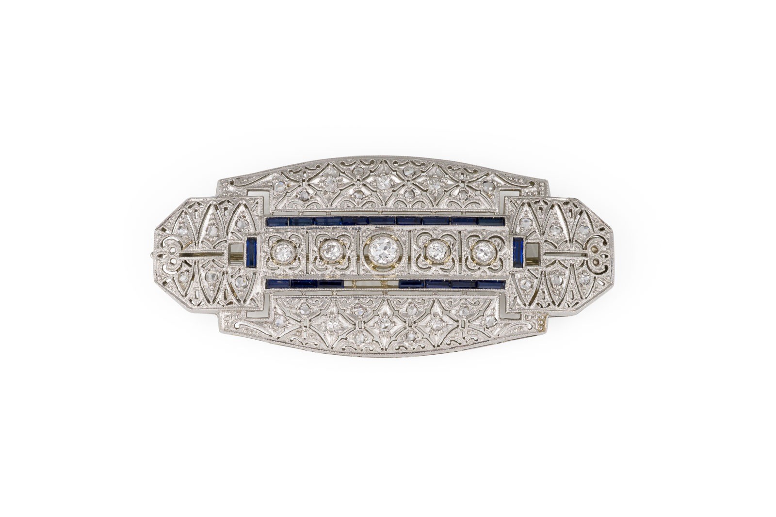 PT. Maße: L. ca 53,6 mm, B.: ca. 23,7 mm. Ges.-Gew.: ca. 12,6 g. Feiner Art Déco Broschenanhänger, besetzt mit Diamanten im Rosen-, 8/8- und Altschliff