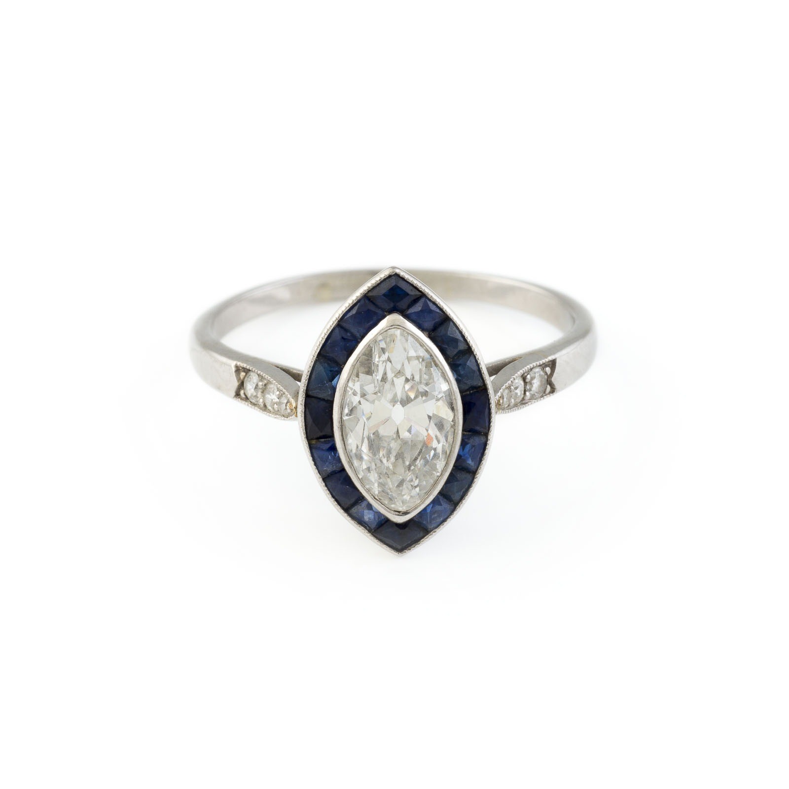 PT (getestet). Ringmaß: ca. 59. Ringkopfmaße: ca. 15,5 mm x 10,3. Ges.-Gew.: ca. 4,4 g. Navetteförmiger Halo Ring mit einem zentralen Diamanten im Navetteschliff von mindestens