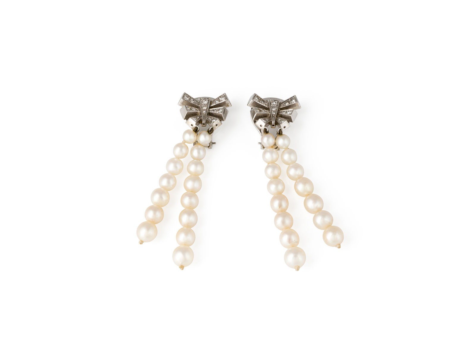 WG 750. Maße: L.: ca. 59,2 mm. Ges.-Gew.: ca. 15,3 g. Art Déco Ohrclips, besetzt mit Diamanten im 8/8-Schliff und jeweils 2 Perlensträngen.