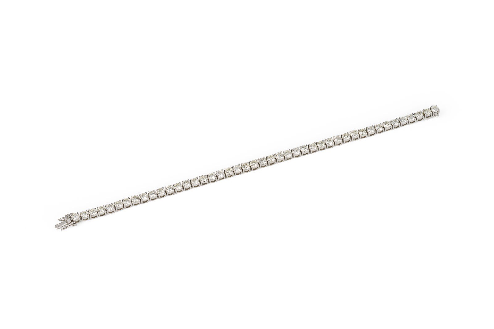 WG 750. L.: ca. 18,0 cm. B.: ca. 3,8 mm. Ges.-Gew.: ca. 15,0 g. Tennisarmband, besetzt mit Brillanten zus. ca. 9.00 ct F/VVS. Kastenschloss mit