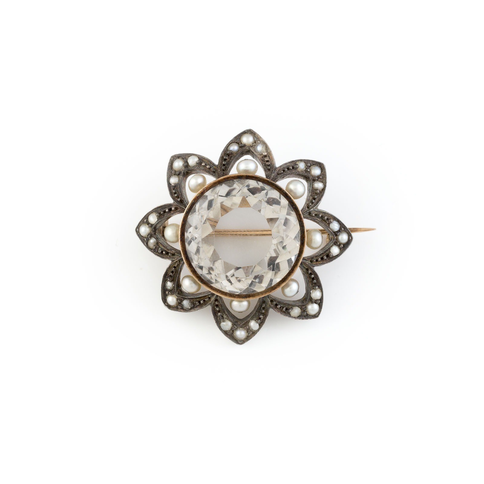 RG 585/AG (getestet). D.: ca. 33,8 mm. Ges.-Gew.: ca. 11,6 g. Stern- bzw. blütenförmige Brosche mit einem zentralen, rund facettierten Bergkristall von