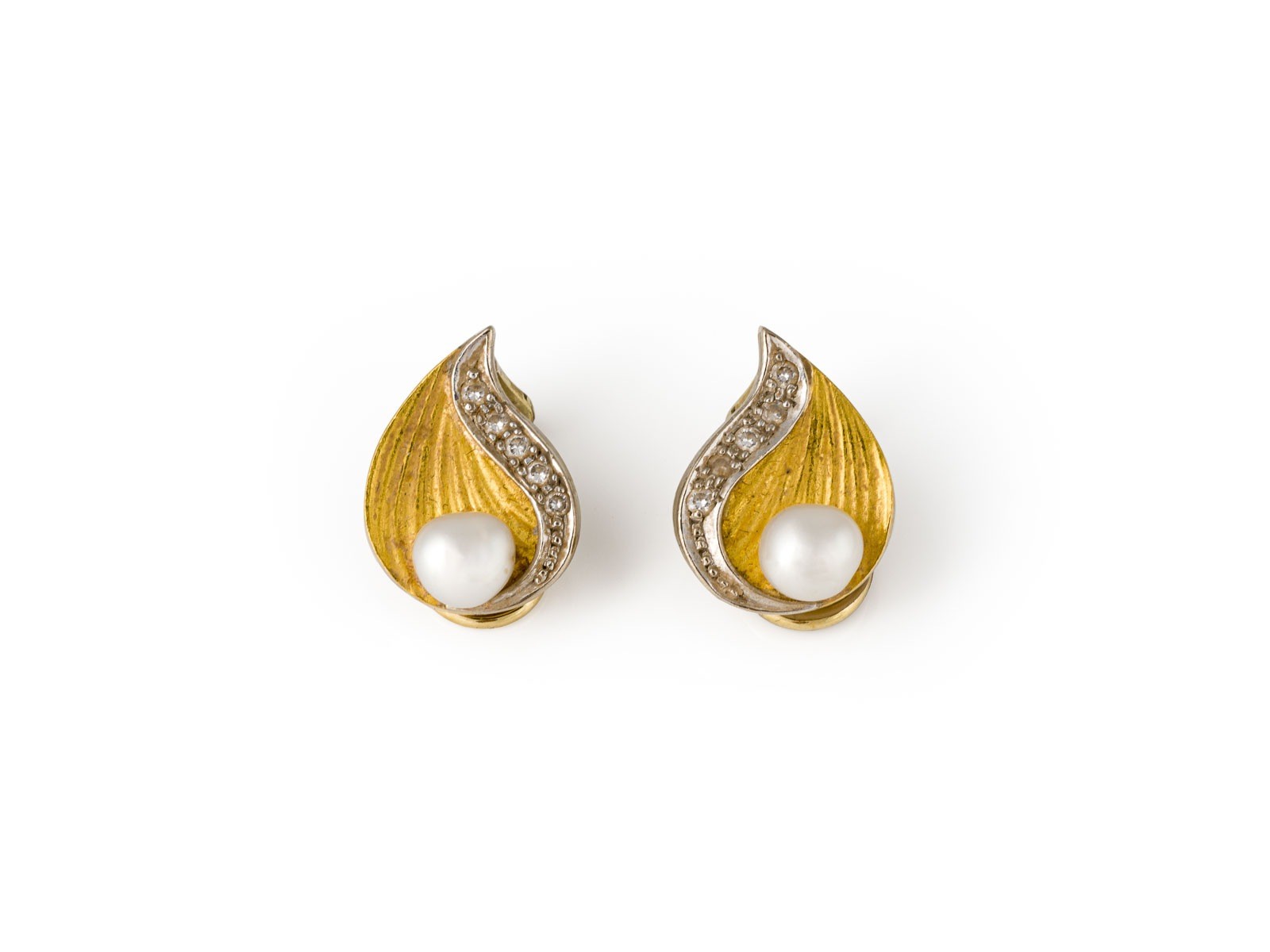 GG 585 (getestet). Maße: ca. 16,4 mm x 12,3 mm. Ges.-Gew.: ca. 5,1 g. Ohrclips in Blattform, besetzt mit jeweils einer Perle. D.(perle): ca. 5,5 mm, sowie