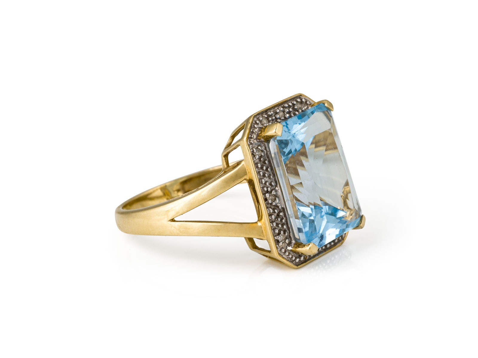 WG/GG 585. Ringmaß: ca. 66. Ringkopfmaße: ca. 19,8 mm x 16,5. Ges.-Gew.: ca. 7,5 g. Großer Cocktailring, besetzt mit einem zentralen Blautopas von ca. 10.70 ct.