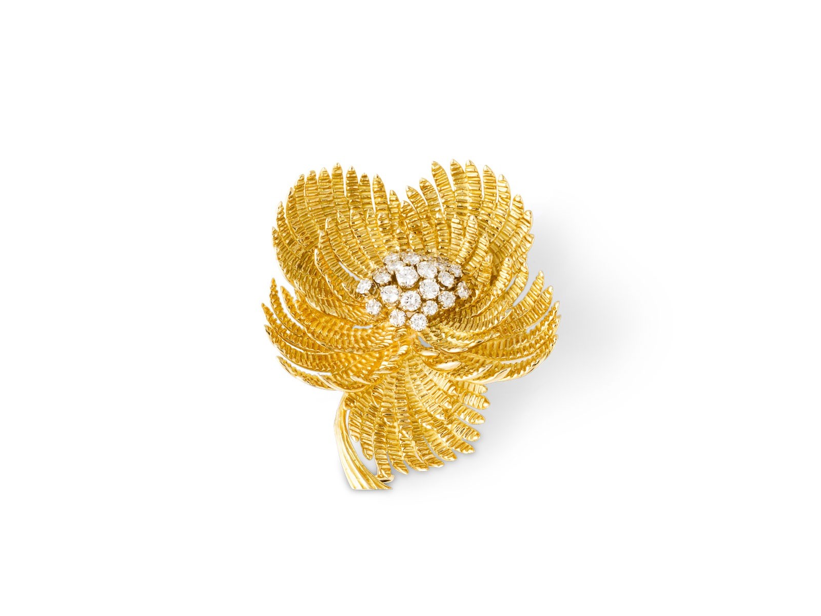 GG 750. Maße: ca. 47,1 mm x 41,4 mm. Ges.-Gew.: ca. 28,3 g. Blütenbrosche, besetzt mit Brillanten zus. ca. 1.00 ct. G-I/VS-SI.
