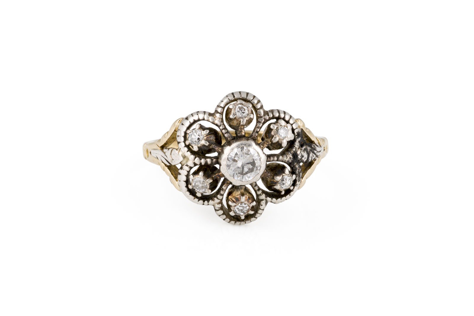 AG/GG 585. Ringmaß: ca. 54. Ringbreite: ca. 14,4 mm. Ges.-Gew.: ca. 3,8 g. Ring in Blumenform, besetzt mit einem zentralen Brillanten von ca. 0.20 ct. I/P, sowie