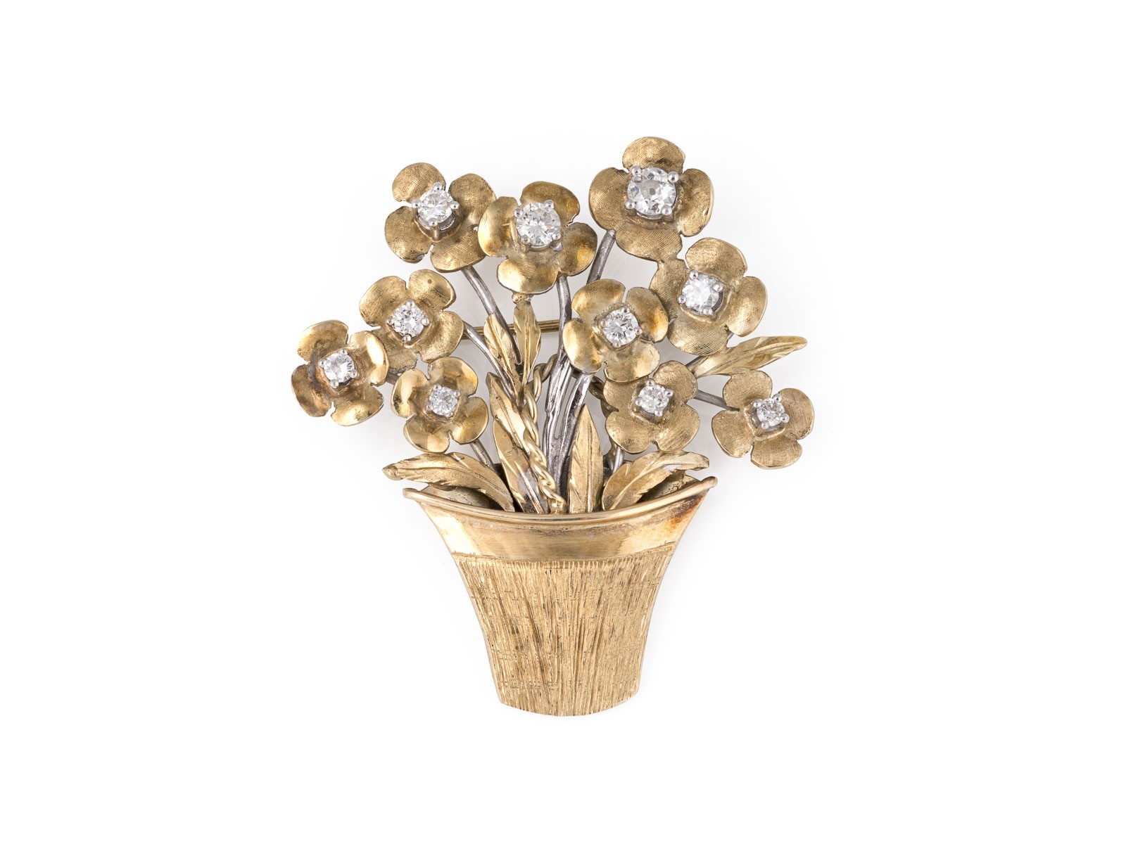 WG/GG 585. Maße: ca. 51,0 x 56,0 mm. Ges.-Gew.: ca. 18,3 g. Brosche in Form eines Blumenkorbs, besetzt mit Brillanten zus. ca. 1.05 ct. H/VS-SI.