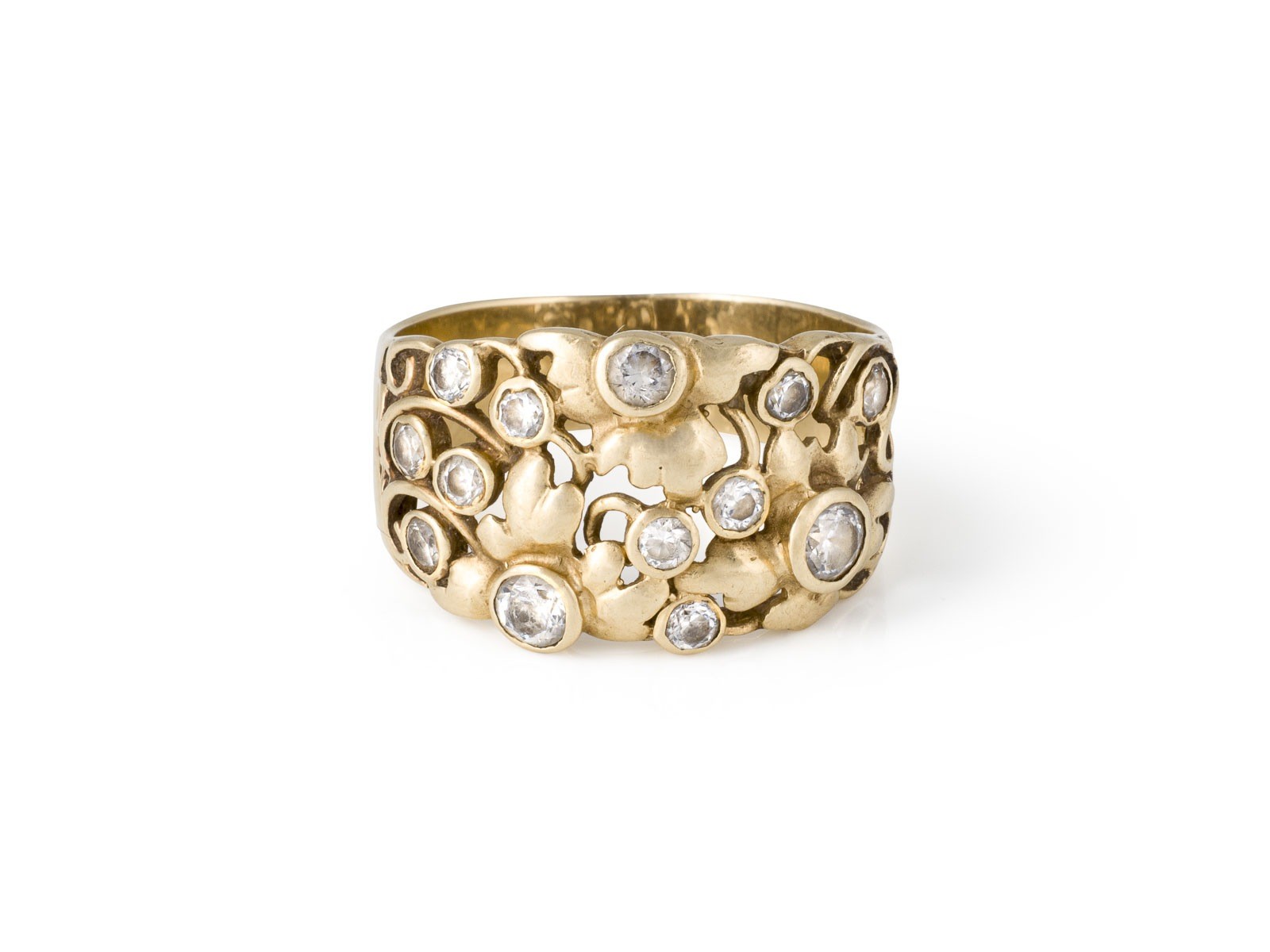 GG 585. Ringmaß: ca. 60. Ringbreite: ca. 13,4 mm. Ges.-Gew.: ca. 5,6 g. Bandring im Blätter-Motiv, besetzt mit farblosen Steinen.