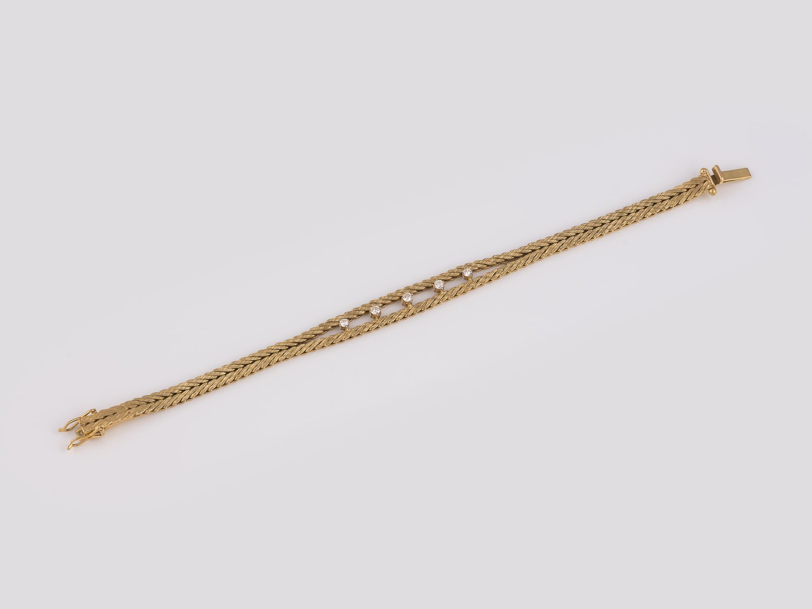 GG 585. L. 16,5 cm. Ges.-Gew.: 13,65 g. Fünf Brillanten, zusammen ca. 0.26 ct. Doppelter Sicherheitsverschluss.