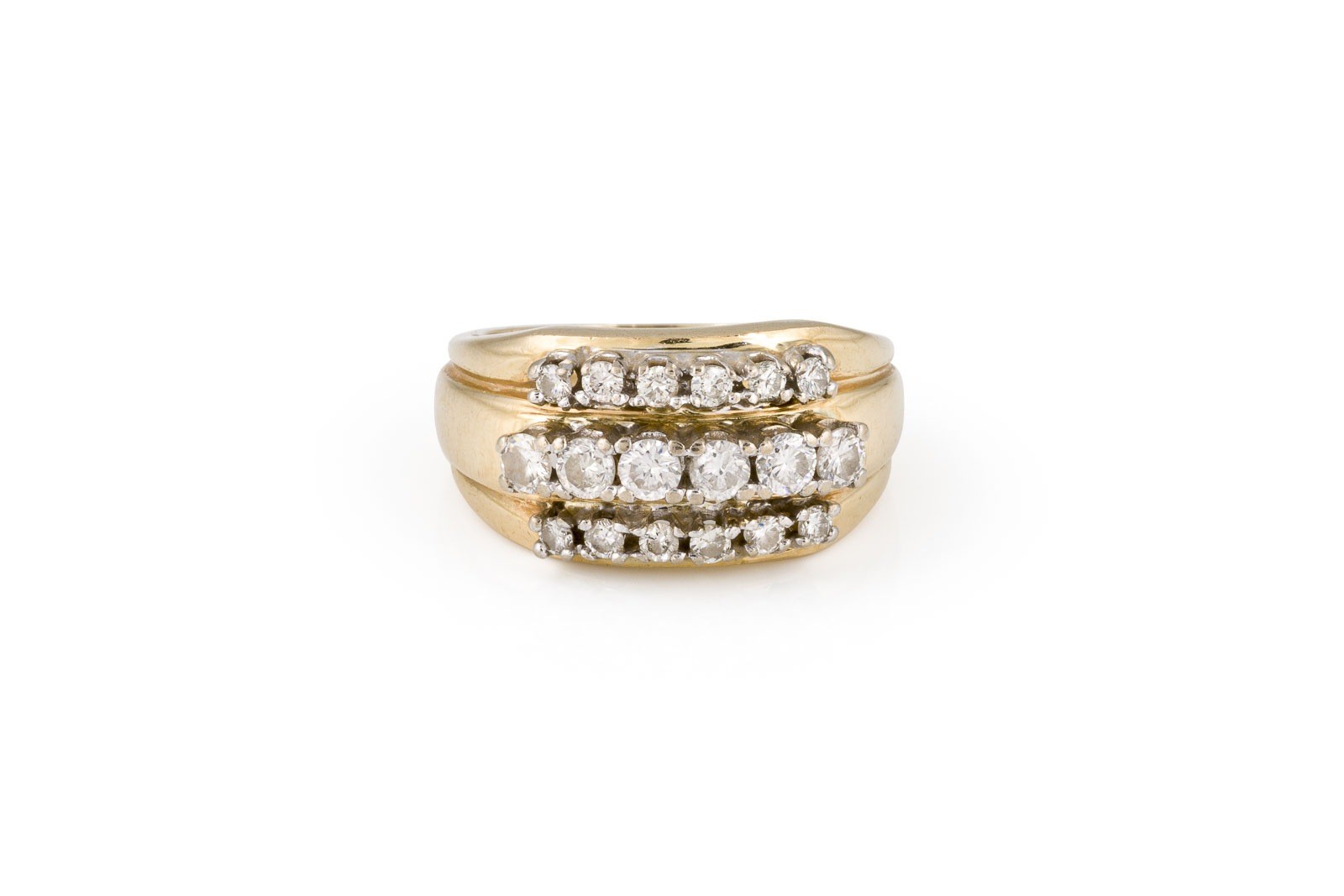 WG/GG 585. Ringmaß: ca. 57. Ringbreite: ca. 11,5 mm. Ges.-Gew.: ca. 9,8 g. Ring, besetzt mit Brillanten zus. ca. 0.81 ct. H/VS-P