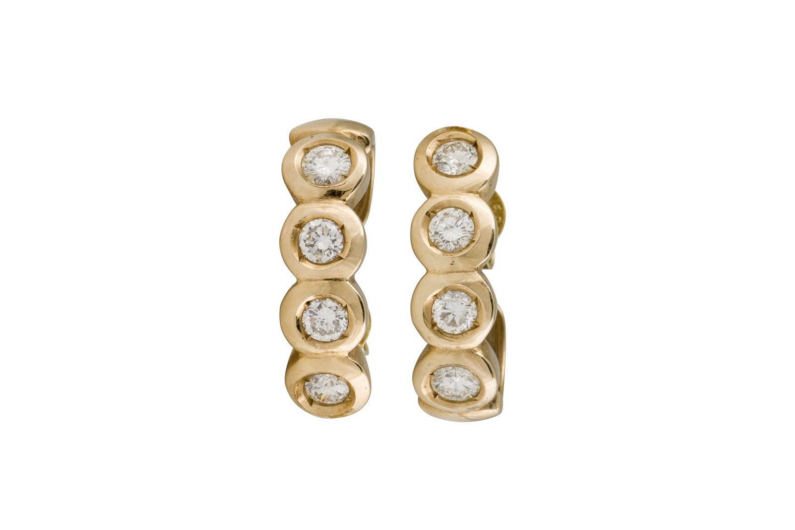 GG 585. Maße: L. ca. 19,3 mm. B: ca. 5,6 mm. Ges.-Gew.: ca. 4,8 g. Halbcreolen, besetzt mit insg. 8 Brillanten zus. ca. 0.60 ct. G-H/VVS-VS.