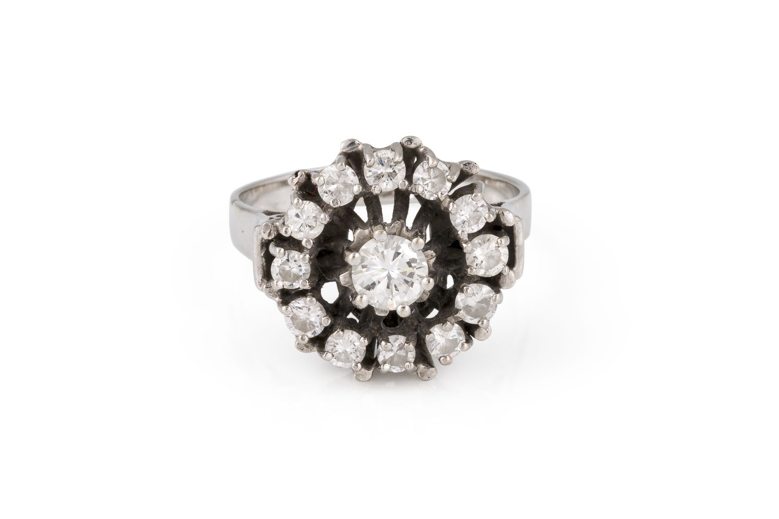WG 750. Ringmaß: ca. 57. D.(Ringkopf): ca. 15,8 mm. Ges.-Gew.: ca. 7,7 g. Ring, besetzt mit einem zentralen Brillanten von ca. 0.36 ct. H/SI, sowie einem Kranz aus