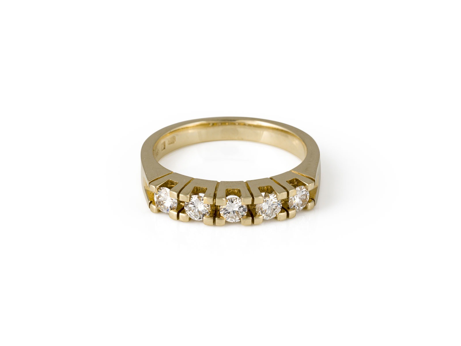 GG 585. Ringmaß: ca. 55. Ringbreite: ca. 3,8 mm. Ges.-Gew.: ca. 4,8 g. Ring, besetzt mit 5 Brillanten zus. ca. 0.52 ct. G-H/VS.